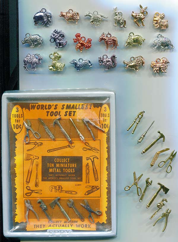 Gumball charms have interested me since I waslittle kid, and still do.When I was a kid in the 1950s, we caught the school bus at a local gas station/old time grocery store in York, Pa.There was only one gumball machine per establishment. We would put our pennies into the machine hoping to get the little gumball charms that came along with the gumball itself. Over those school years, I accumulated quite a collection of the little plastic charms and put together many sets. About 30 years ago, cleaning out some of my things, my mother gave me my big jars filled with charms, and I fell in love with them all over again. Since then and continuing now that I have retired from a teaching career, Ive been growing and specializing the collection through eBay and antique co-ops.I buy and trade to complete certain sets and have accumulated over 15,000, which are mostly displayed in glass-front jewelry cases. These cases can also easily be hung on the wall. The history of the gumball charm business began with the Eppy Co. in New York.Samuel Eppy started manufacturing the copper, silver, and gold flashed or coated charms, opening the Samuel Eppy Co. in Jamaica, N.Y.,in 1938. According to researcher Jeffrey Maxwell, Samuel Eppy was a leader in the bulk vending industry who pioneered both vacuum plating and vacuum metalizing for plastics. Vending companies used these plastic charms to boost gum sales, putting them in capsules (small gum-filled eggs). In the heyday of vending machine charms, in the 1940s and 50s, Eppy was considered the largest manufacturer. For years, I corresponded with Mrs. Samuel Eppy, who wrote the large molds weighed a thousand pounds each. Sand-like material was poured into the mold and baked, like muffins, she wrote.Mrs. Eppy worked on the production line in the early 40s and wrote that girls would take the baked-like charms and paint them with different colored lacquer. The girls would wrap some varieties by hand. When the charms were ready, they were bagged to be sold to vendors. In one letter, Mrs. Eppy stated she and the other workers would play with the beautiful colored charms. Mrs. Eppy sent me copies of promotion sheets the company sent to gumball machine vendors. Companies would order charms from the sheets, which had black and white photos of what was available and the price per thousand. The Food & Drug Admistration stepped into the gumball machine business in the 1950s as machine vendors had the charms in with the gumballs.Lacquer from the charms rubbed off on the gumballs. The charms pictured here showcase a small fraction of what Ive put together.Much of my interest over the years has been complete sets of certain types of charms, and its truly been a fun pursuit.